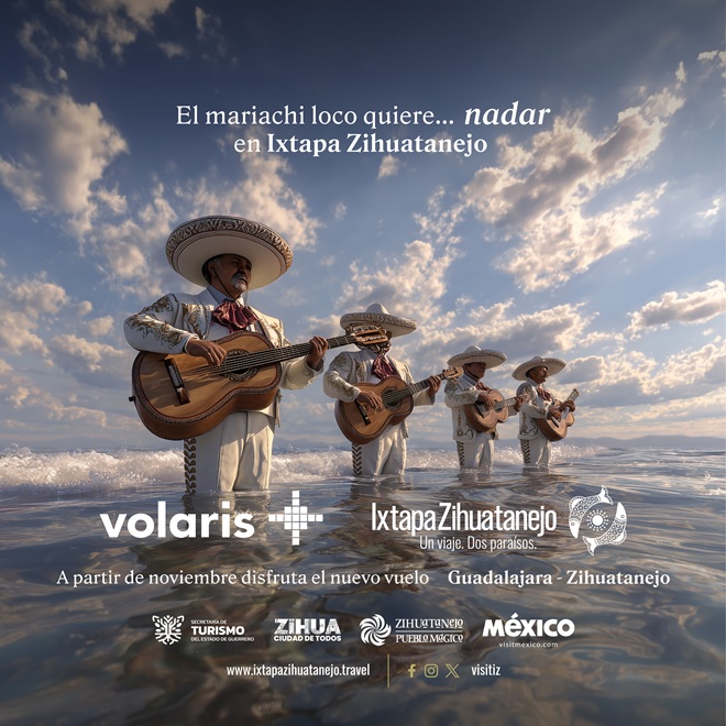 En este marco, la Oficina de Convenciones y Visitantes de Ixtapa Zihuatanejo impulsa esta nueva conexión aérea con su campaña creativa “El Mariachi Loco quiere…”, una campaña que conecta dos símbolos muy poderosos de México: el mariachi, ícono universal de Jalisco, y el mar de Ixtapa Zihuatanejo, destino turístico por excelencia.