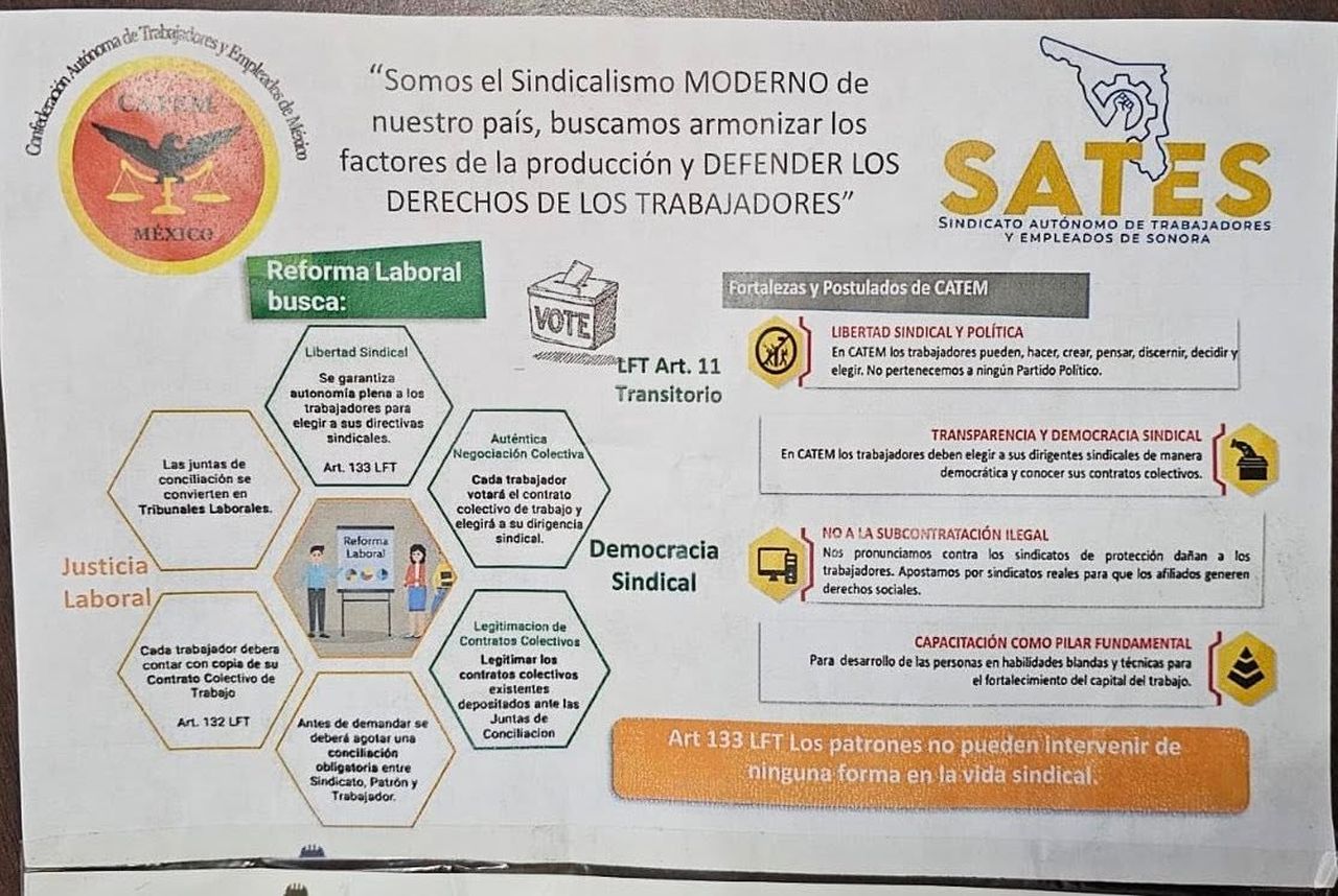 Las denuncias señalan a liderazgos sindicales vinculados a la Confederación Autónoma de Trabajadores y Empleados de México (CATEM) en la entidad, particularmente a Carolina Lara Moreno, Marisela Parra Martínez y Brenda Esquer Palma, por promover solicitudes de constancias de representatividad con firmas presuntamente falsificadas, sin conocimiento ni consentimiento de los trabajadores. Dichas constancias son utilizadas para exigir la firma de contratos colectivos y emplazar a huelga, generando presión económica directa sobre las empresas.