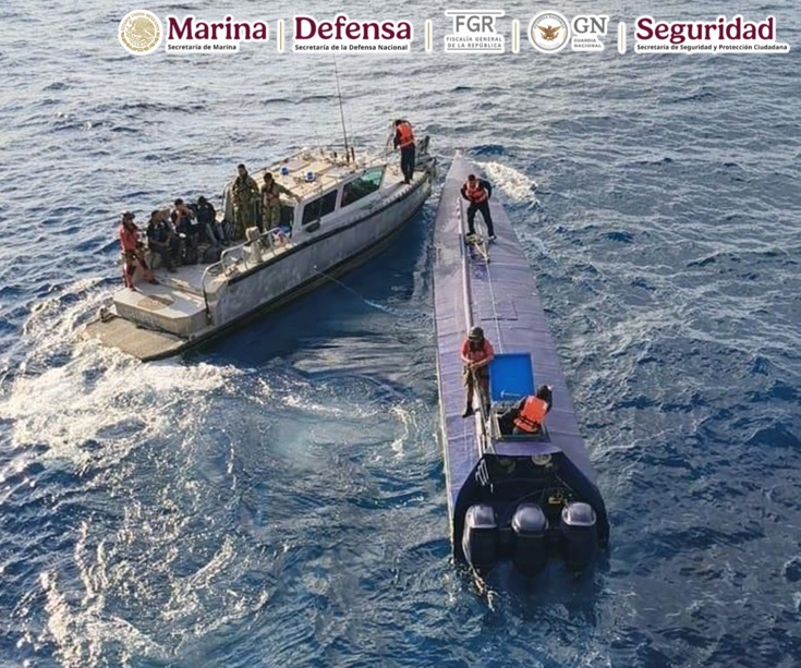 En una operación marítima encabezada por elementos de la Secretaría de Marina (Semar) a través de la Armada de México en funciones de Guardia Costera, en coordinación con la Secretaría de la Defensa Nacional (Defensa), Fiscalía General de la República (FGR), Guardia Nacional (GN) y Secretaría de Seguridad y Protección Ciudadana (SSPC), durante operaciones de vigilancia y seguridad marítima, se logró el aseguramiento de una Embarcación de Bajo Perfil (LPV por sus siglas en inglés) o semisumergible, con tres tripulantes y aproximadamente 179 bultos de distintas dimensiones que representan varias toneladas de posible cocaína, en espera de que las autoridades competentes determinen el peso ministerial, al momento de hacer su entrada a puerto.